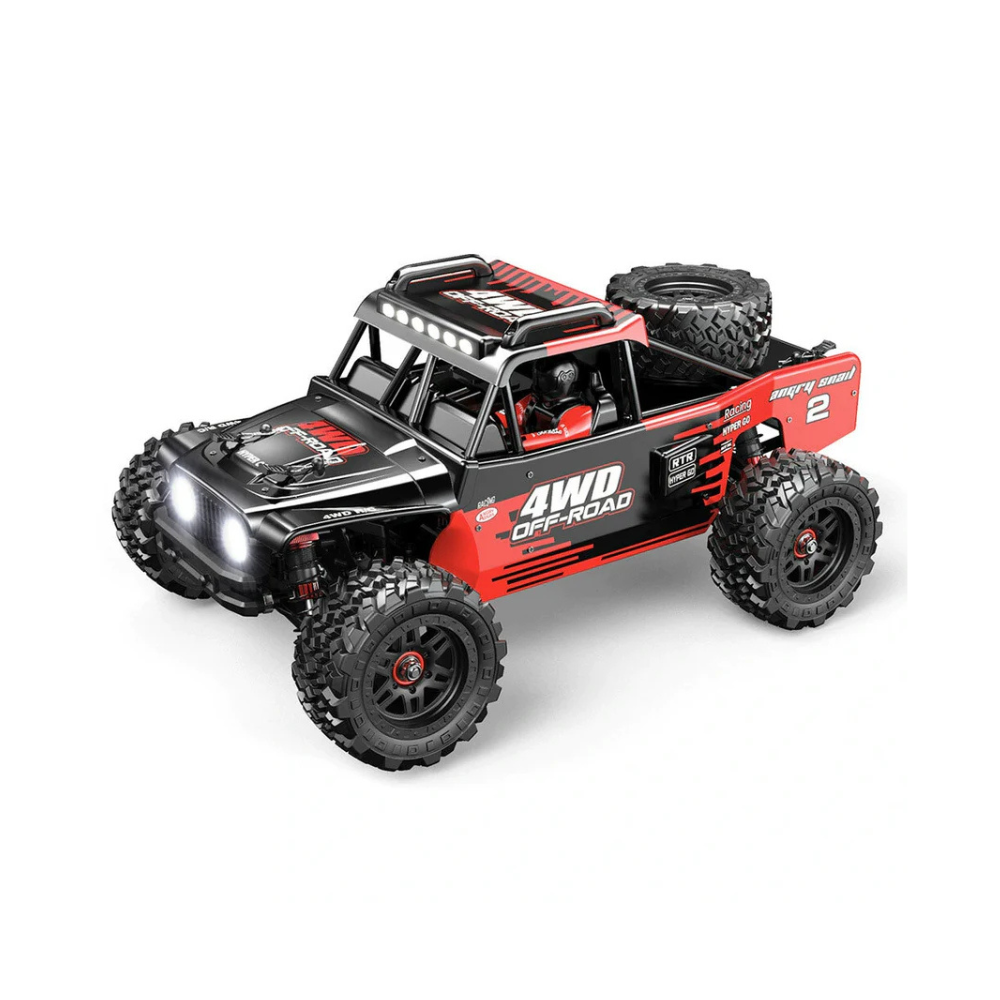 The MJX Hyper Go 14209 is a 1/14 scale brushless 4-wheel-drive RC truck. This vehicle is equipped as Ready-to-Run with a remote control, receiver, servo, ESC, motor, battery and charger providing everything required for operation, except for the two AA batteries necessary to power the 2.4GHz digital remote. Additionally, it boasts an extensive assortment of spare parts.